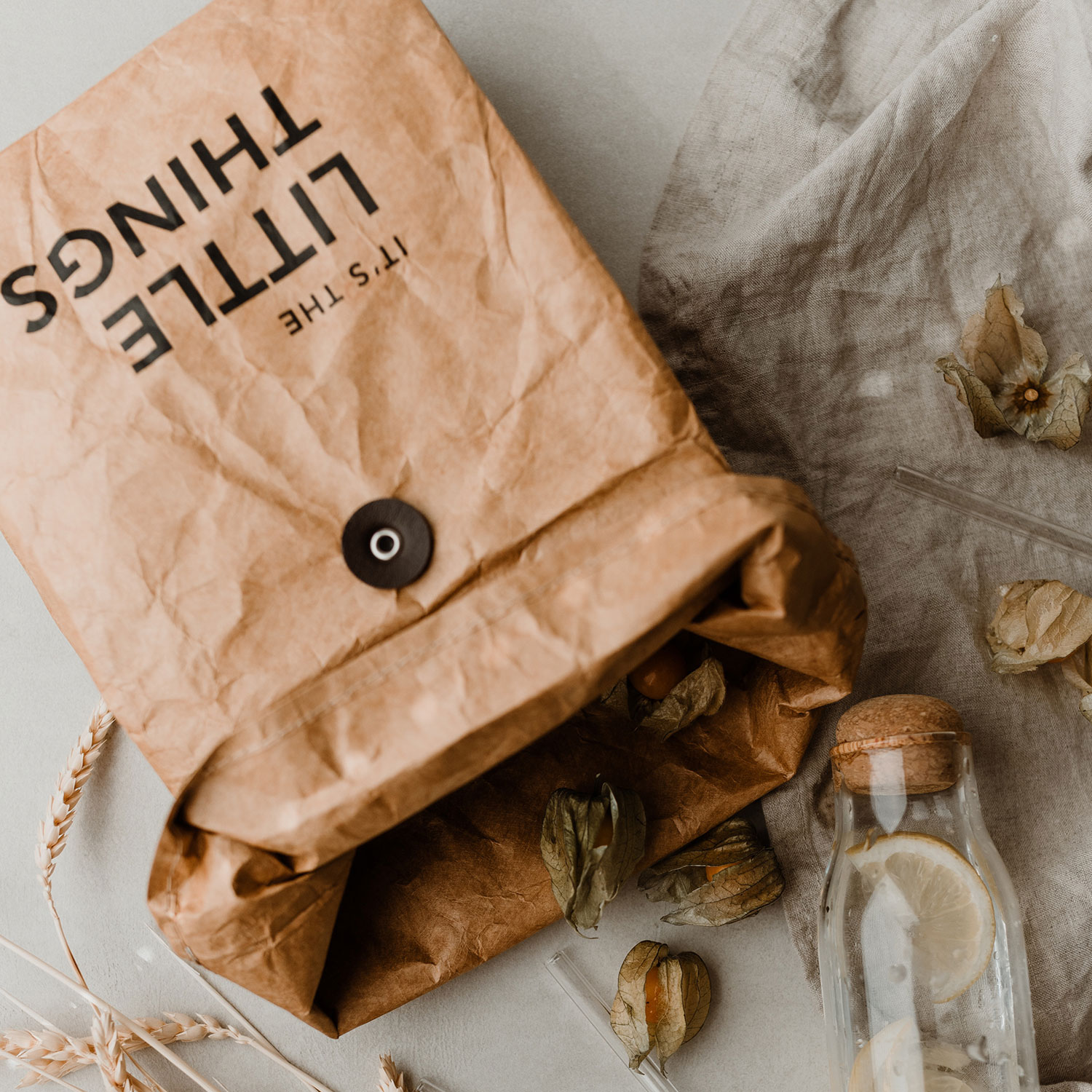 Chladicí taška na potraviny je vyrobena z omyvatelného papíru a uvnitř má tenkou izolační vrstvu. Nejenže je absolutním originálním vizuálním detailem, ale také je mimořádně praktická. Je úžasně lehká, dá se srolovat a lze ji kdykoli jednoduše setřít mokrým hadříkem, takže ji budete moci používat opakovaně. Přední stranu tašky zdobí slogan „It’s the little things“ a zadní stranu zdobí malé logo. Chladící taška Little Things se skvěle hodí i jako dárkové balení, protože koho by nebavilo praktické a opakovaně použitelné dárkové balení? Ideální i na jedlé dárečky pro vaše blízké.