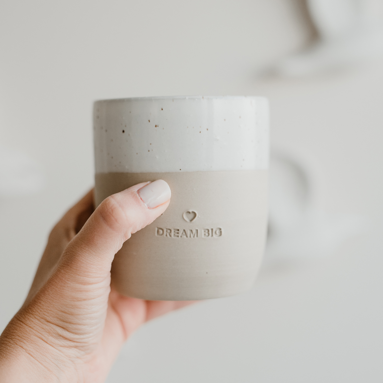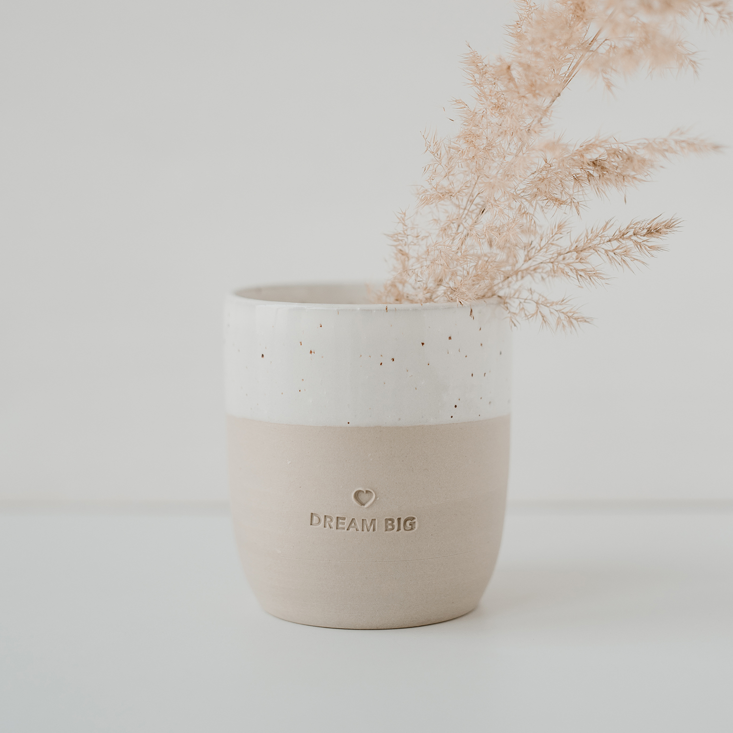Vytvořený pro všechny, kteří nikdy nepřestávají snít. Jsme rádi, že vám můžeme představit dalšího člena rodiny kameninových hrnků, ručně vyrobený hrneček Dream Big. Do kolekce hrnečků z hlediska tvaru, tónu, glazování a designu, bylo vloženo hodně srdce a duše.