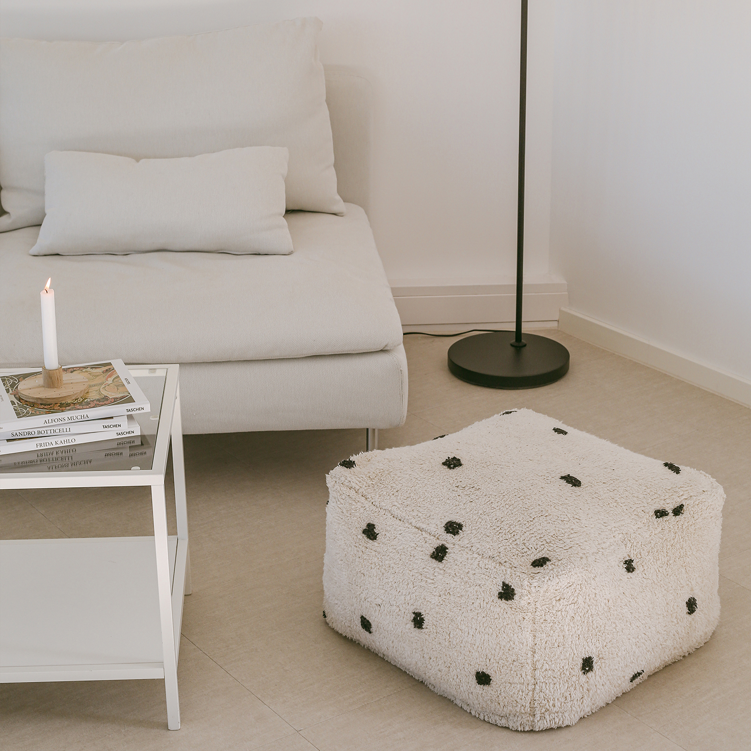 Konečně je to tady, puntíkovaný pouf! V souladu se skvělými pratelnými tkanými koberci máme nyní v našem sortimentu také plyšové a měkké taburety, které v mžiku oživí váš domov jako stylový designový bytový doplněk .