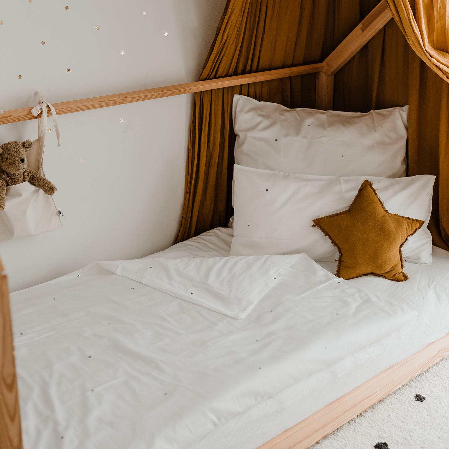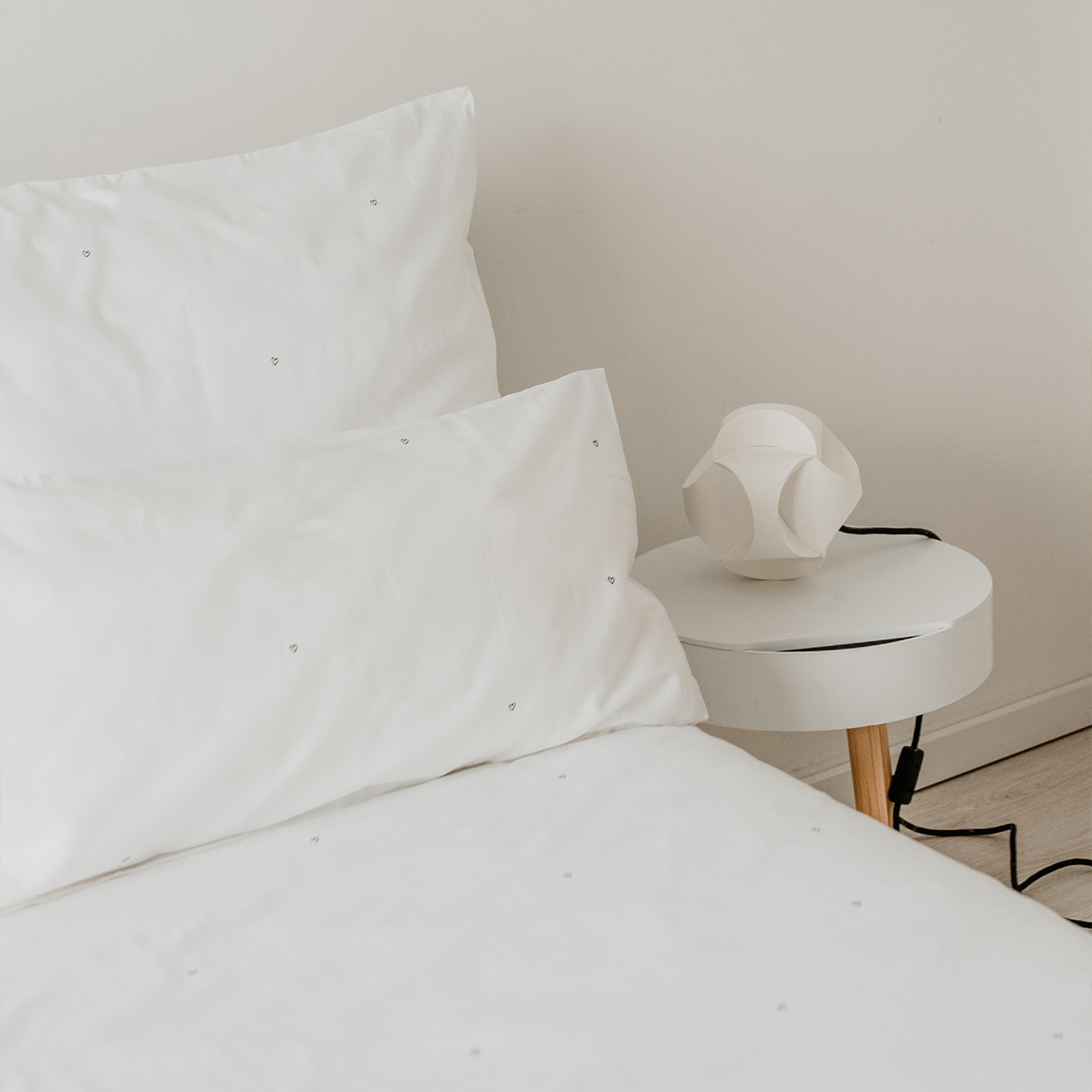 Ložní prádlo je vyrobené ze 100% organické bavlny a získalo certifikaci GOTS. Byla to velmi dlouhá cesta, na které se vyzkoušelo hodně různých typů bavlněné výroby. Ale povedlo se! Látka je máslově měkká a spánek v tomto povlečení je čirou radostí. Zapínání peřiny je na zip, takže z povlaku nebudou nikdy trčet rohy peřiny. Polštář má zapínání na patentky, díky kterým nic netlačí.
